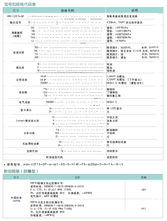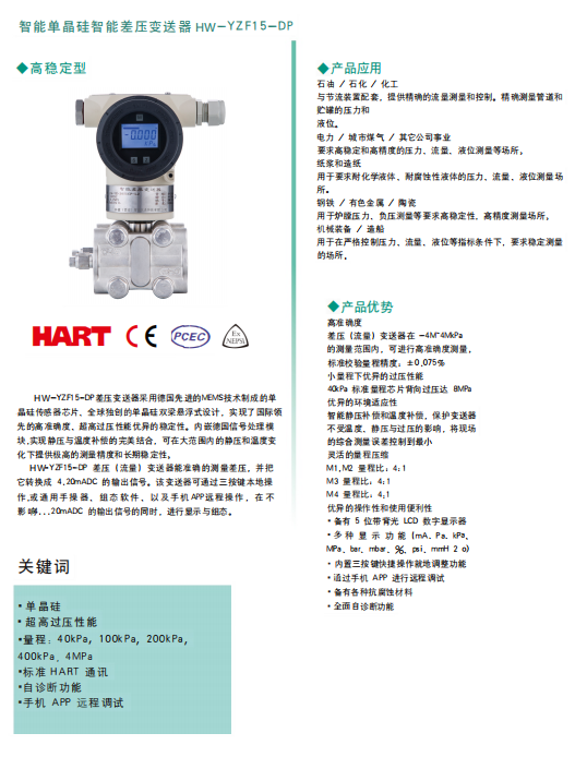 • HW-YZF15-CP直连压力变送器 HW-YZF15-PA绝压变送器 HW-YZF15-DR微差压变送器 HW-YZF15-DP差压变送器